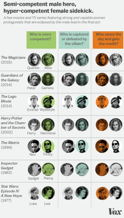 To be clear, I’m not saying that every story with a competent female sidekick and a semi-competent male hero is necessarily bad or even anti-feminist. The problem with this trope lies less in its individual occurrences and more in its sheer prevalence. As with the Bechdel test, the analysis that grows out of looking at this trope is most interesting when it’s directed at overall trends, not at isolated instances.